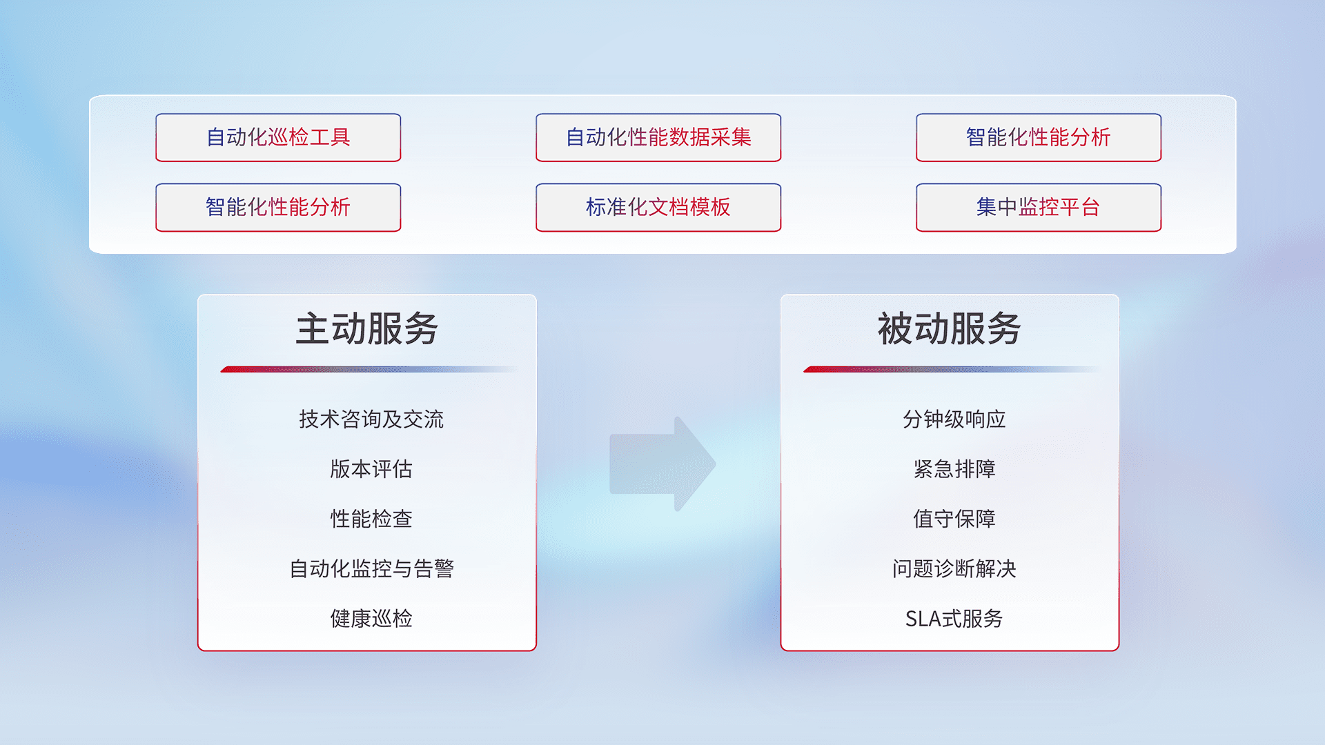智能化工具和标准化文档,,,保障服务质量,,提供主动服务(包含技术咨询、、、版本评估、、、、性能检查、、自动化监控与告警、、、、健康巡检)和被动服务包含(分钟级响应、、、、紧急排障、、、、值守保障、、、问题诊断解决、、SLA服务)。。。