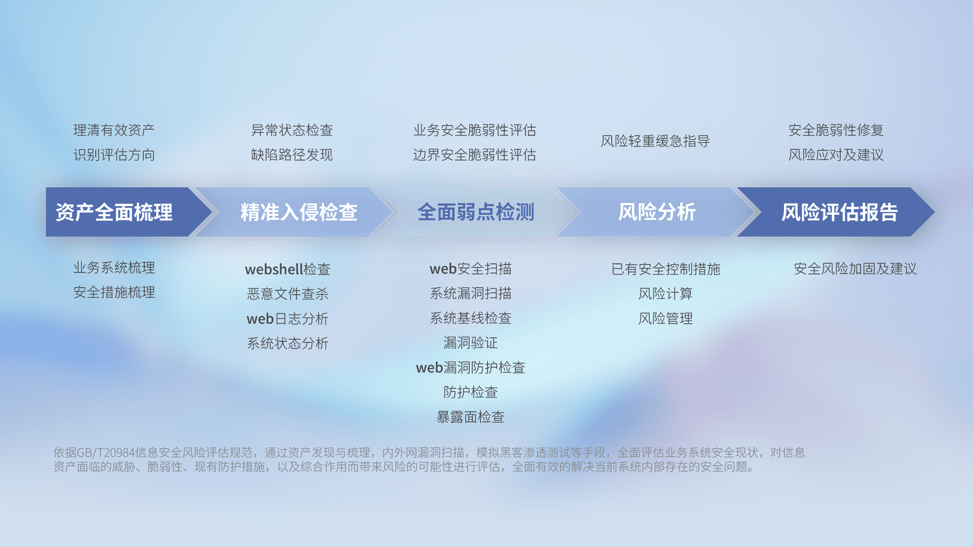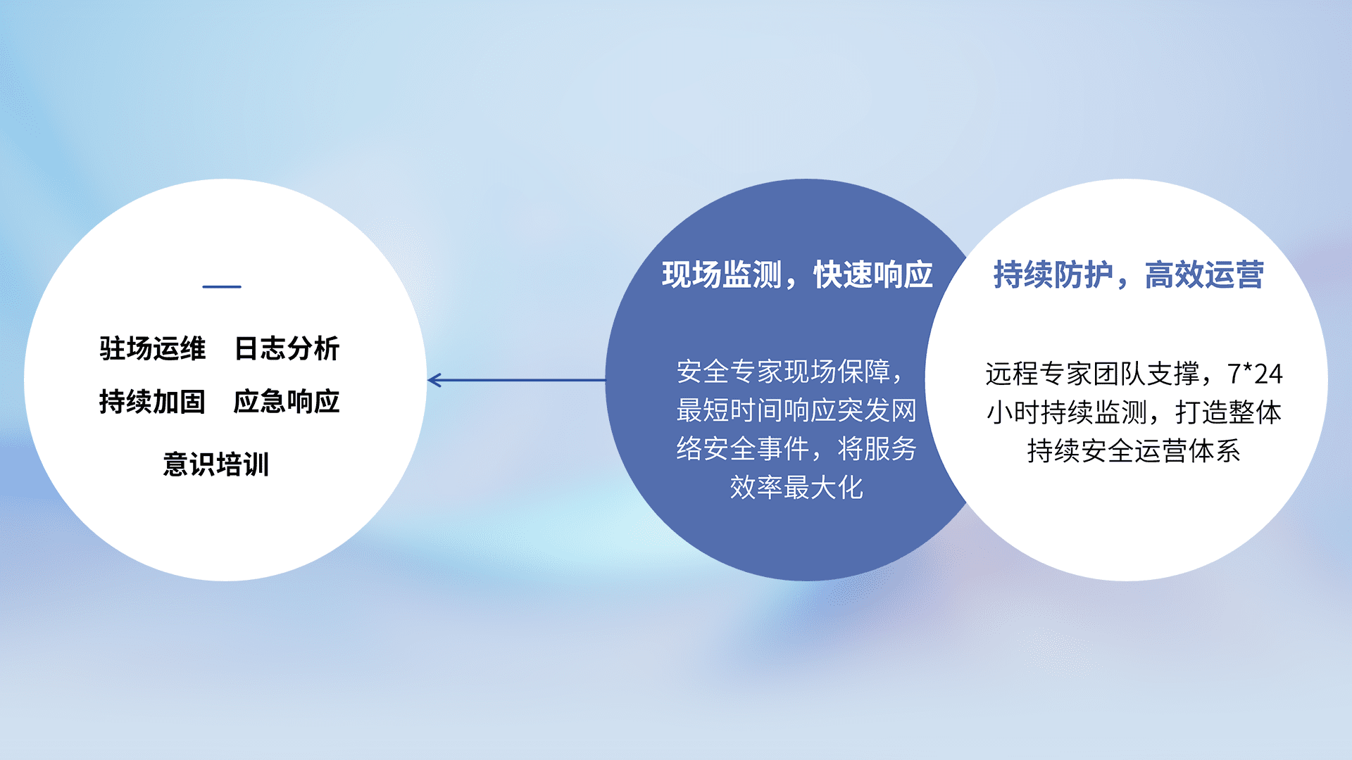 针对客户行业特性,,,,以专业的安全服务+多厂商联合解决方案提供专属的一站式安全管理服务,,帮助客户全面感知网络空间威胁,,,基于识别、、、检测、、、分析、、、防护、、、监测、、响应的服务理论模型,,从方案咨询、、集成交付、、、评估验证、、优化加固、、、、运维运营,,致力于为客户提供完整的闭环管理式安全服务。。以实战经验为客户打造高抵御风险的安全体系,,帮助客户发现威胁、、、对抗威胁、、、、处置威胁,,,不断积累安全对抗能力,,,持续保障数字化安全。。